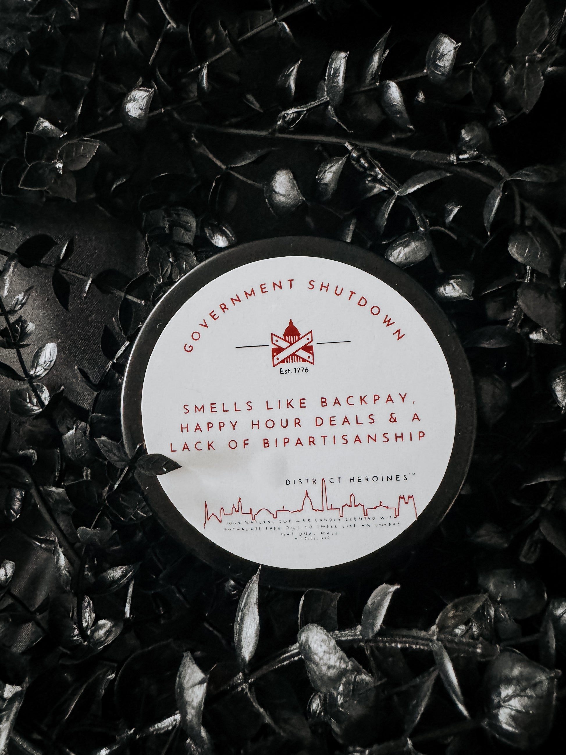 A limited edition 5 oz candle. Smells like backpay, happy hour deals & a lack of bipartisanship.